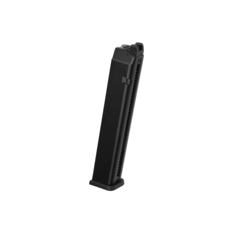 Chargeur grande capacité en métal, fonctionnant au gaz vert, compatible avec les répliques de pistolets G17 et G18. Fabriqué à partir d'alliages métalliques et de polymères résistants, ce chargeur offre d'excellentes performances, une grande fiabilité et une capacité de 50 billes.